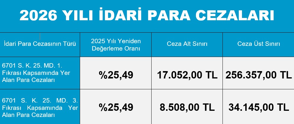 Bu kapsamda, 6701 sayılı Türkiye İnsan Hakları ve Eşitlik Kurumu Kanununun "İdari yaptırımlar" başlıklı 25. maddesinde sayılan idari para cezaları 1/1/2026 tarihinden itibaren yukarıda belirtilen miktarlarda uygulanacaktır.